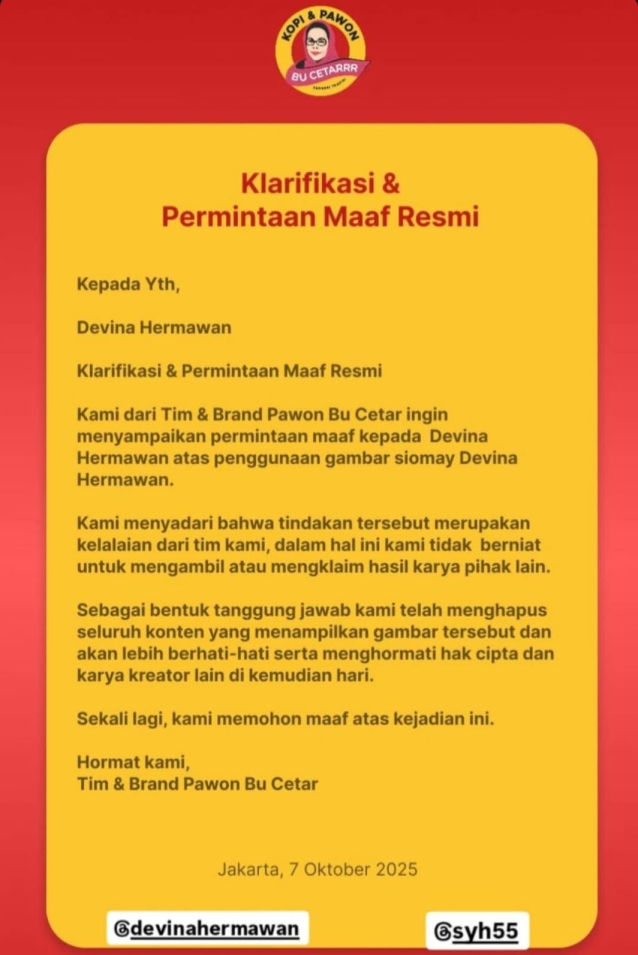 "Kami dari tim dan brand Pawon Bu Cetar ingin menyampaikan permintaan maaf kepada Devina Hermawan atas penggunaan gambar siomai Devina Hermawan. Kami menyadari tindakan tersebut merupakan kelalaian dari tim kami, dalam hal ini kami tidak berniat untuk mengambil atau mengklaim hasil karya pihak lain," bunyi surat permintaan maaf itu.
