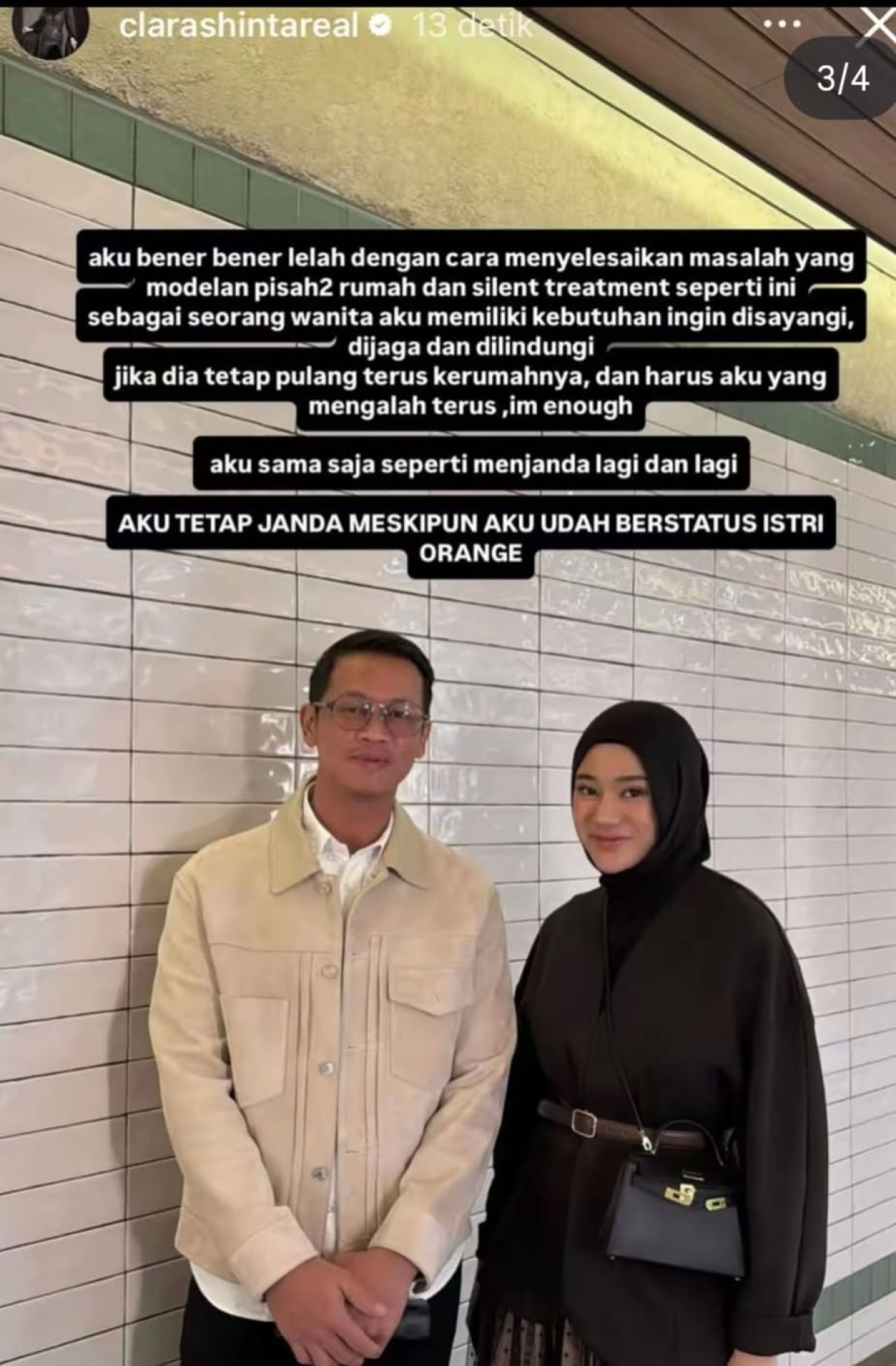 Kabar buruk ini diungkap sendiri oleh Clara Shinta di Insta story pribadinya. Dia mencurahkan isi hati dengan membeberkan prahara rumah tangganya yang baru dibangun pada (30/8/2025).