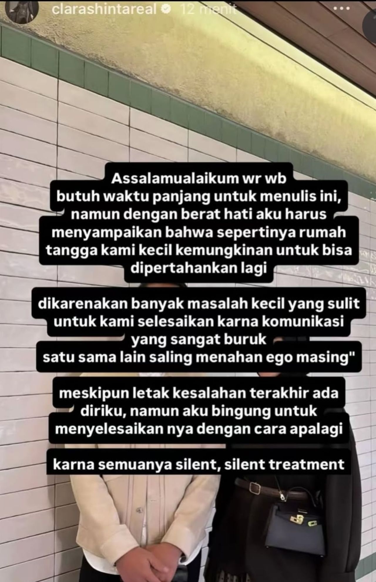 "Assalamualaikum wr wb, butuh waktu panjang untuk menulis ini, namun dengan berat hati aku harus menyampaikan bahwa sepertinya rumah tangga kami kecil kemungkinan untuk bisa dipertahankan lagi," tulis Clara mengawali curhatannya yang telah dihapus.