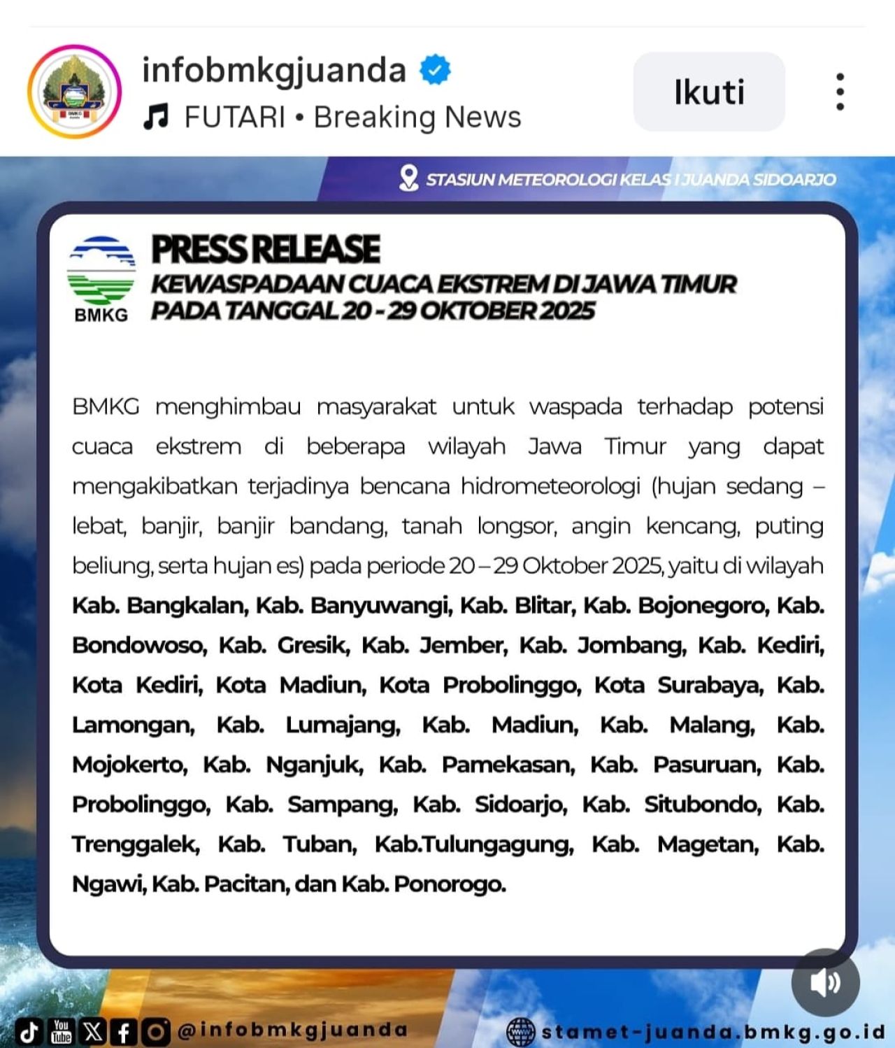 Jawa Timur, MCI News – Badan Meteorologi, Klimatologi, dan Geofisika (BMKG) Juanda mengeluarkan peringatan waspada potensi cuaca ekstrem di wilayah Jatim, 21–29 Oktober 2025. Hal ini bertepatan dengan wilayah Jatim yang tengah memasuki masa peralihan musim atau pancaroba.