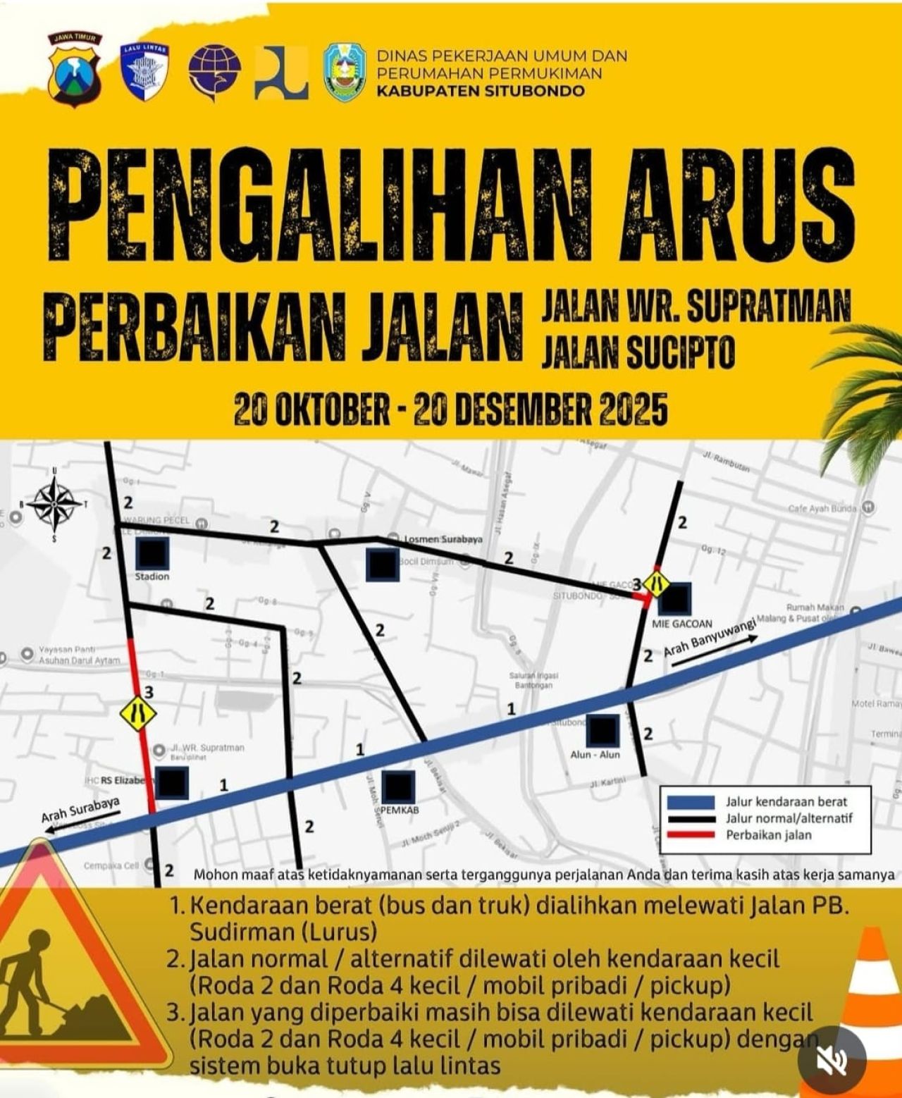Selama masa perbaikan, kendaraan besar seperti truk dan bus akan dialihkan melalui Jalan PB Sudirman. “Kendaraan dari arah Surabaya–Bali maupun sebaliknya kami arahkan ke PB Sudirman, supaya tidak terjadi penumpukan di sekitar lokasi proyek,” jelas Kasat Lantas Polres Situbondo, AKP Nanang Hendra Irawan.