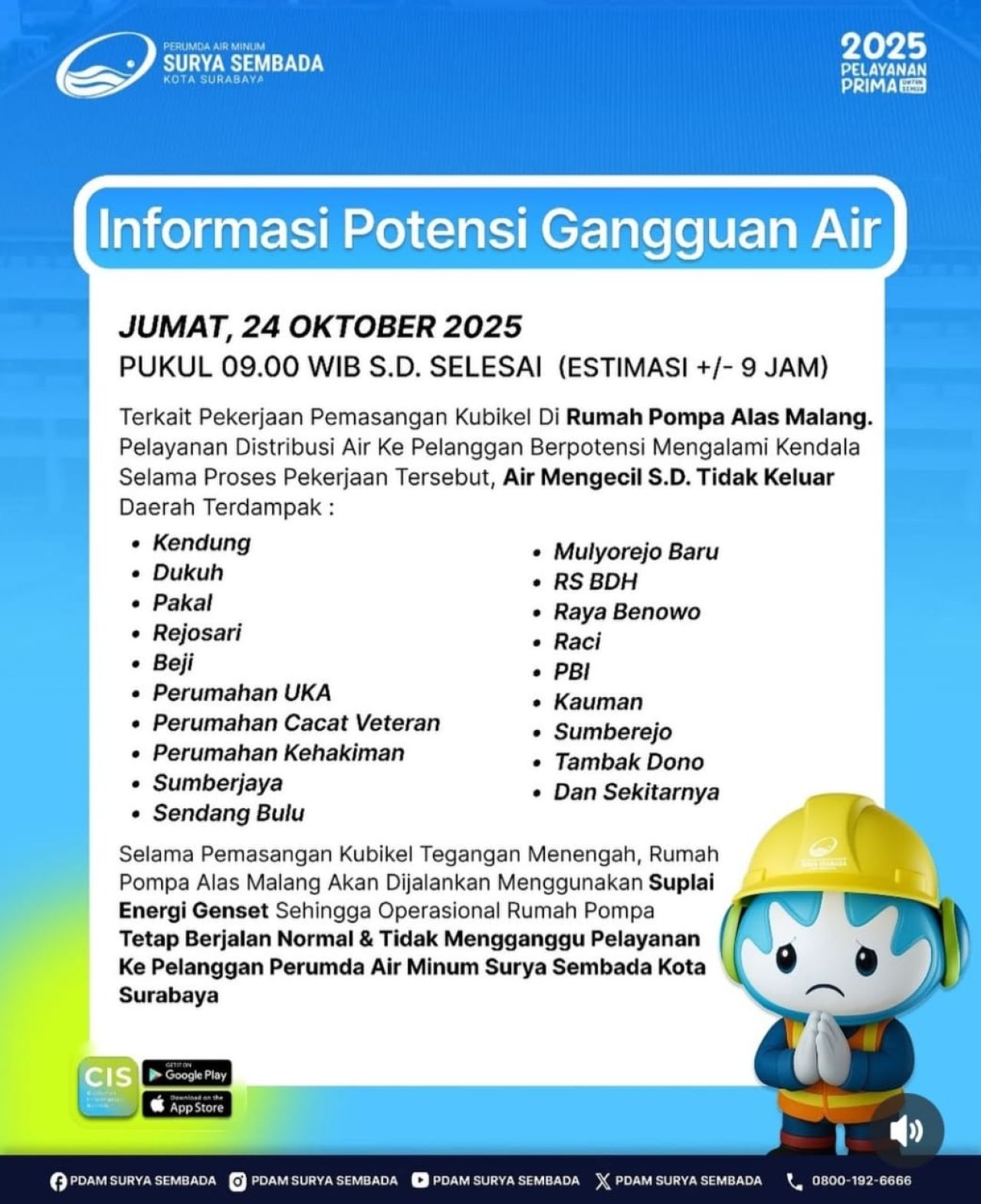Surabaya, MCI News – Warga di sejumlah kawasan barat Surabaya diminta bersiap menghadapi gangguan pasokan air bersih, Jumat (24/10/2025) mulai pukul 09.00 sampai selesai. Estimasinya selama sembilan jam.