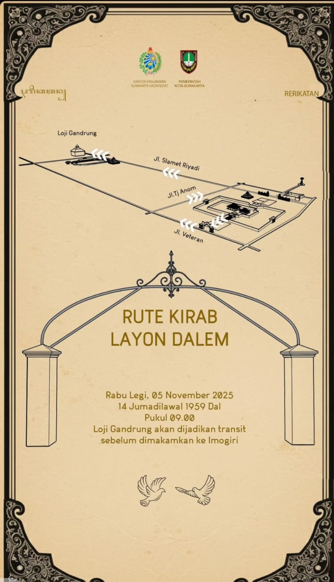 Surakarta, MCI News – Selama prosesi berlangsung iring-iringan jenazah Raja Keraton Kasunanan Surakarta, Hadiningrat Pakubuwono (PB) XIII, Rabu (5/11/2025), sejumlah ruas jalan di sekitar keraton akan mengalami penutupan dan sterilisasi untuk menjaga kelancaran serta kekhidmatan acara adat tersebut.